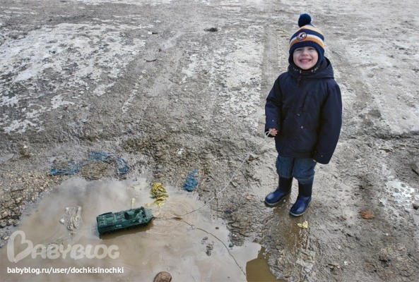 Вариант третий. Совсем не транспортный. Но где-то рядом. Хорошие сапоги! Да, да! Просто купите ребенку . Такую, чтобы «море по колено» и при этом сухо и тепло. Явный минус – это время, которое, как известно, на вес золота, а ваш малыш осторожно крадется по тропинке и никак не хочет прибавлять шаг. Тогда уж терпение, терпение и еще раз терпение! Ведь скоро все это закончится. Выглянет по-настоящему весеннее солнце и будет радовать, и радовать…Лета-то как захотелось!!!!!