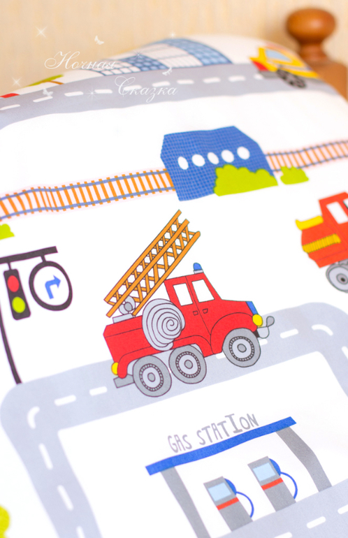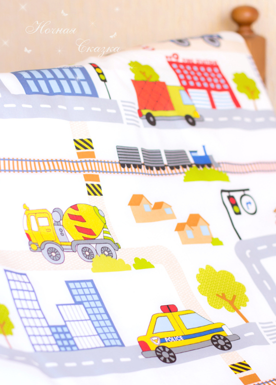 Постели и комлекты в кроваткуВаш малыш любит машины? А строительную технику? Постель на которой расположился целый город с множеством разной техники приведет в восторг Вашего кроху! Чего здесь только нет: тут и экскаваторы, и самосвалы, и бетономешалки, полицейские, пожарные машины, есть даже железная дорога с поездом и много-много построенных домов и дорог между ними с настоящими дорожными знаками и светофорами!