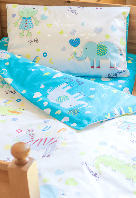 Это постельное бельё подойдет для первой детской кроватки, а также для следующей "ясельной" кроватки. Размеры у комплекта стандартные, поэтому бельё идеально подойдёт к Вашему одеялку и подушке. Т.к. в пододеяльнике вшита потайная молния, то одеяло не будет неаккуратно выглядывать из прорези.
