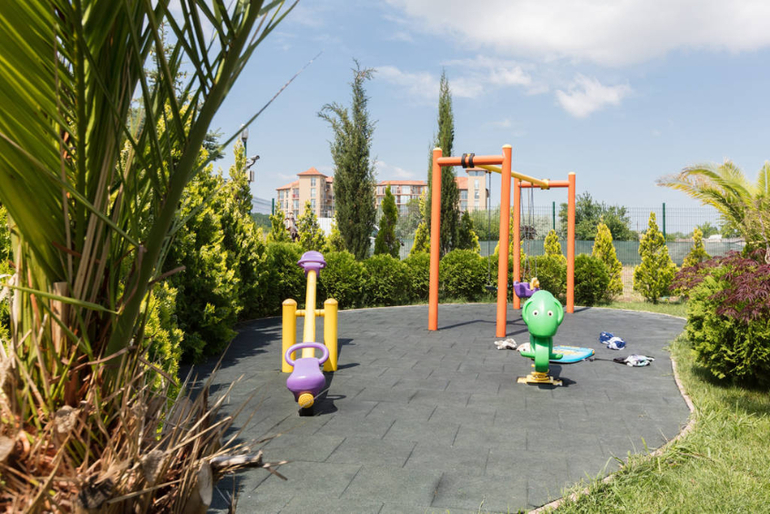 На внутренней территории 2 больших и 2 детских бассейна, окруженные деревянными лежаками . От солнца всегда можно курыться под зонтами или на уютных диванах. Есть свои детская и спортивная площадки, у одного из бассейнов бар. Но шум от него беспокоить не будет - окна выходят в тихий переулок. Территория всегда закрыта и круглосуточно охраняется, дети гуляют внутри в полной безопасности.