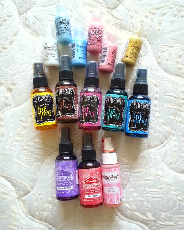 Разбираю запасы: 5 спреев dylusions (гсиний и розовый почти полные, бирюза на 1/3 израсходованна, коричневый и желтый на 2/3), 2 tim holtz, (почти полные) 1 mister hueys studio calico (израсходован на 2/3), 2 глиттера( розовый и голубой) полные, 4 жидких жемчуга(полные)