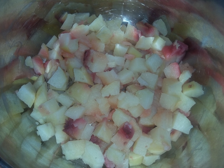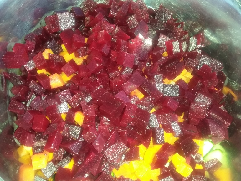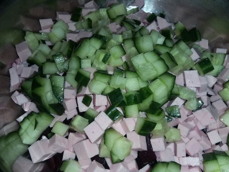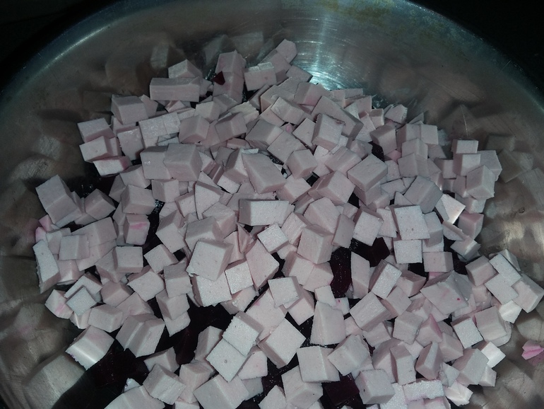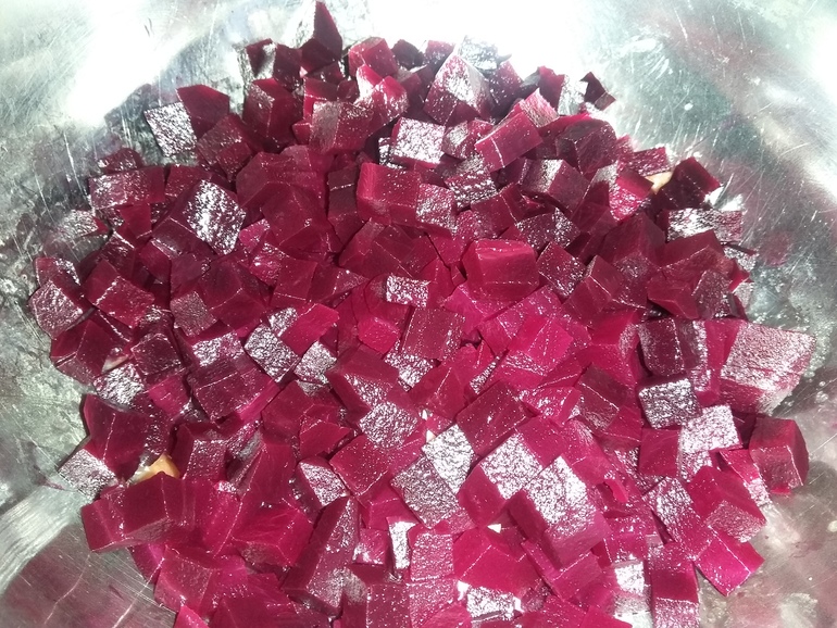 Отварить свеклу, остудить, очистить, нарезать кубиками: