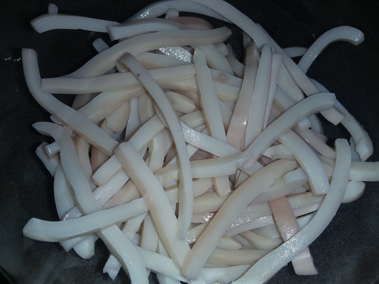 Кальмаров очистить от пленок, опустить в кипящую подсоленную воду, готовить 3 минуты. Затем опустить в холодную воду и быстро остудить: