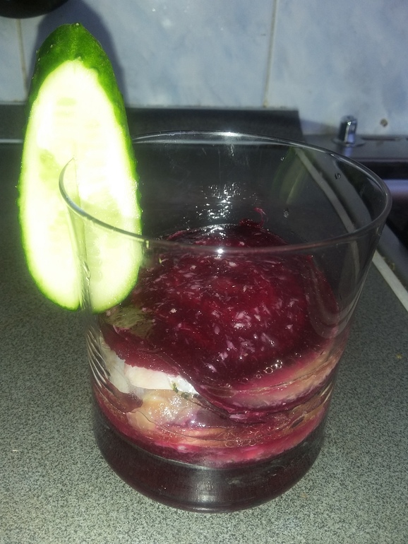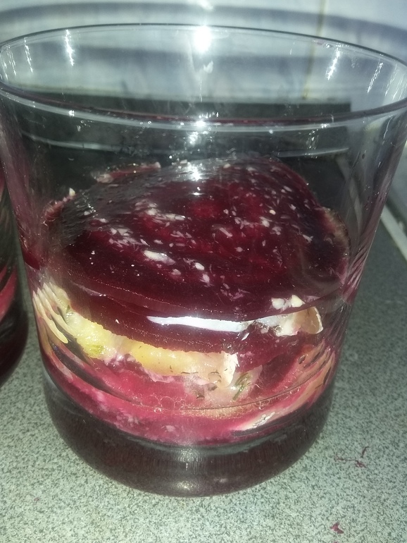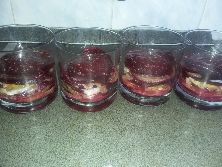 Подготовленные ингредиенты для карпаччо из свеклы разложите по стаканам слоями: