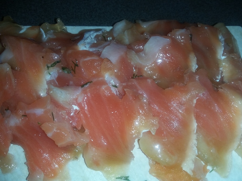 Слабосоленую красную рыбу, если она целым куском, нарезать тонкими ломтиками: