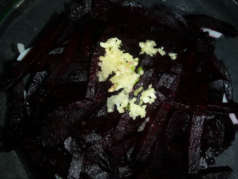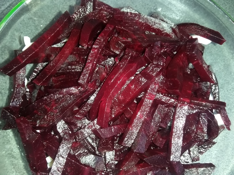 Отварную (а лучше запеченную) свеклу очистить, нарезать длинными ломтиками: