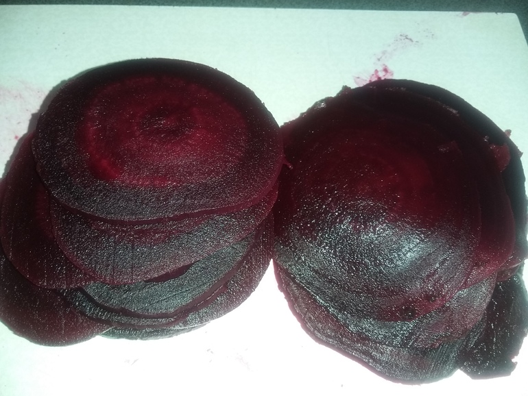 Остывшую свеклу запеченую очистить и тонко нарезать (слайсами):