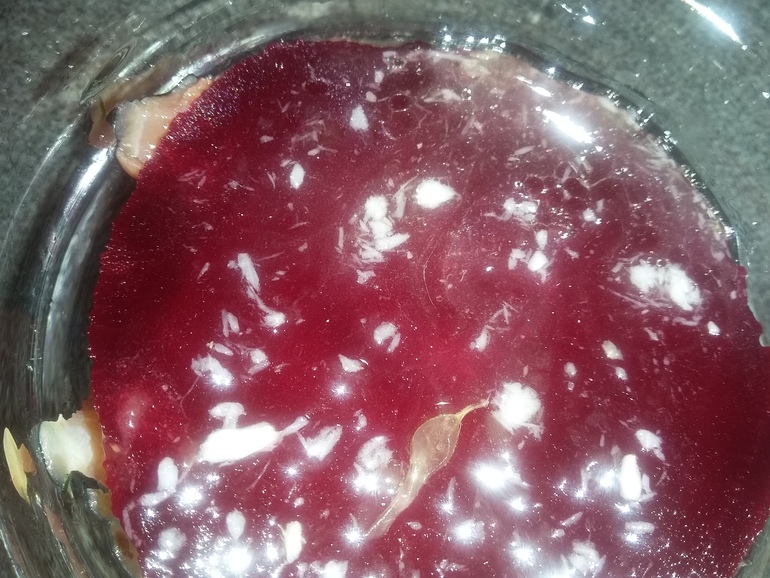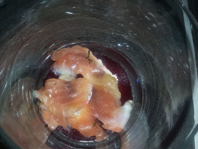 1-й слой - кружочки свеклы, 2-й ломтики лосося (семги):