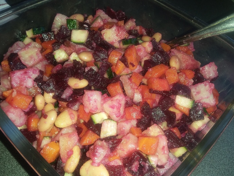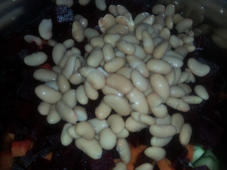 Дать салату с фасолью настояться в течение 30-60 минут. На винегрет совсем не похоже!