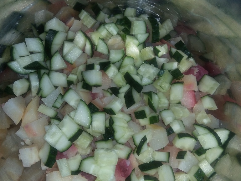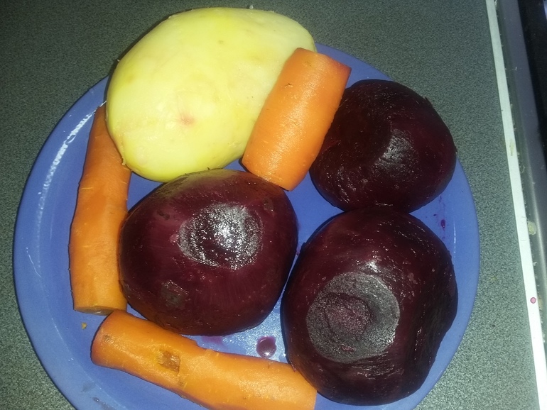 Отварить свеклу, картофель и морковь. Остудить, очистить: