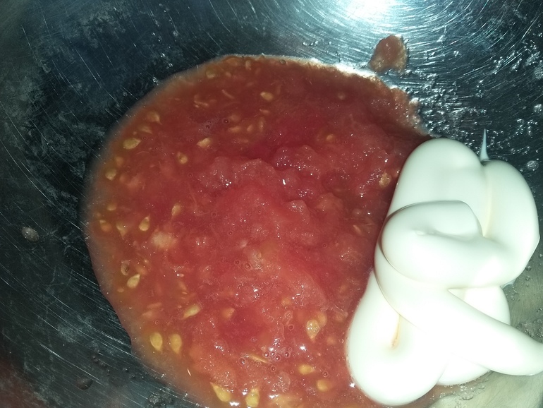 Натереть спелый помидор на мелкой терке (шкурку выкинуть), смешать с майонезом:
