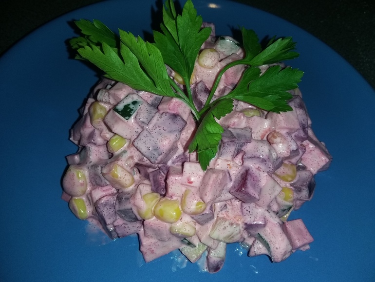 В этот раз салат с кальмарами, свекольный "Оливье", салат с фасолью, карпаччо из свёклы.