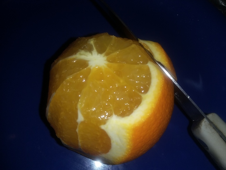 Мякоть апельсина нарезать тонкими кружочками. Нарезайте апельсин над тарелкой, чтобы в нее стекал сок: