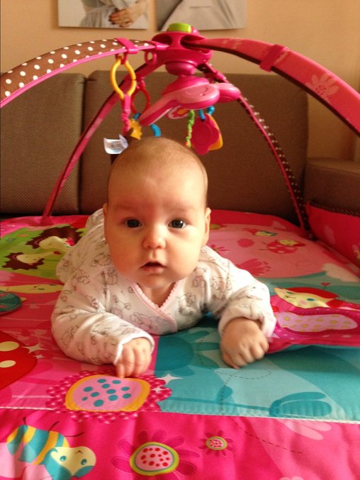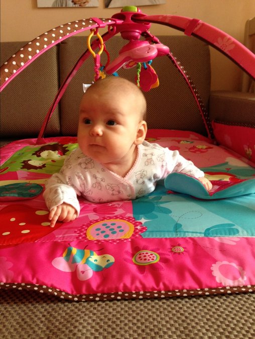 Голову держит хорошо, на животике нравится лежать и глазеть по сторонам. Спим тоже хорошо (до сих пор мне не верится, думала, что колики с нами до школы будут). Да и вообще Виолетта неприхотливая девочка - подойдёшь к ней - радуется, не подойдёшь будет себе лежать и смотреть на игрушки. Может долго сама себя занимать, то ногами подрыгает, то палец пососёт - это она вообще обожает, соску не признаёт, а вот большой пальчик прям любит. Думаю, что как только начнёт игрушки брать, так про пальчик и забудет.