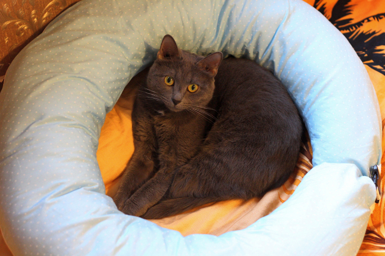 Когда мы оставляем подушку без присмотра и забываем закрыть в комнату дверь, наш котик быстро находит себе уютное местечко: