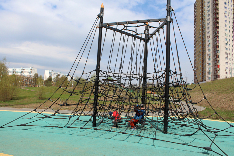 Веревочная пирамидка - настоящая паутина, Дима не смог сам выбраться, пока Тёма не подсказал, как.