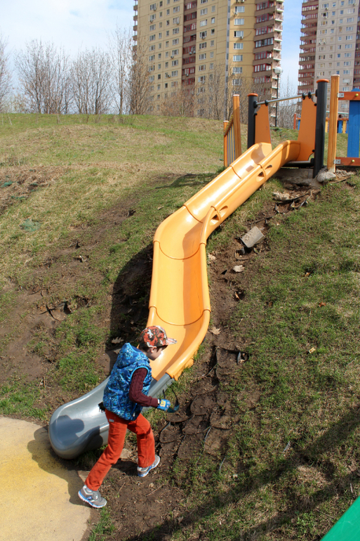 Это основная площадка. Скатившись по трубе, Тёма сказал "супер!". Мы тоже с Димкой туда залезали, но там очень тесно для взрослого.