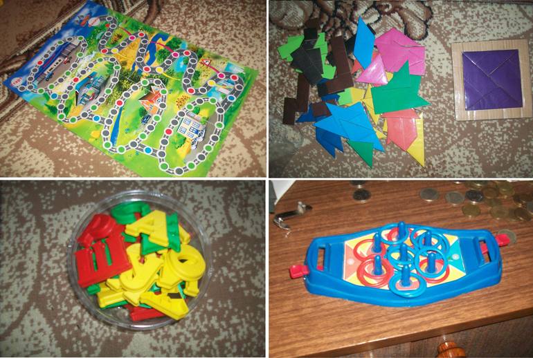 Еще мы любим играть в игры-ходилки, собираем квадраты Никитина, учимся из отдельных букв складывать слоги (уже умеет), играем "в колечки".