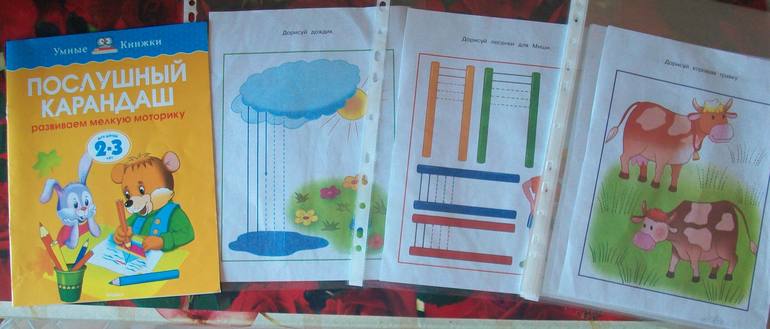 Учимся проводить прямые линии. Для этого я приобрела специальную книжку. Всё вкладываю в файлы и рисуем фломастерами, а потом сам с удовольствием стирает всё тряпкой