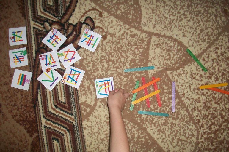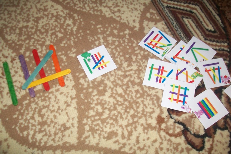 Еще одна наша новинка - игра с палочками эскимо. Идею увидела давно здесь на ББ и вот только сейчас воплотила. Нужно собрать палочки по образцу-карточке: