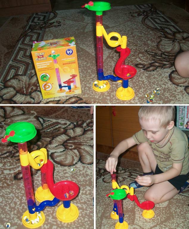 Купили, и я сама с удовольствием катаю по нему шарики. Максим на радостях скатывает их сразу по нескольку штук. Шарики застревают, плохо едут, он их подталкивает пальчиком и всё равно снова повторяет то же самое. А еще мы его переделываем, чтобы шарики скатывались в какой-нибудь определенный низ: или я сама, или Максим переделывает горки по своему вкусу.