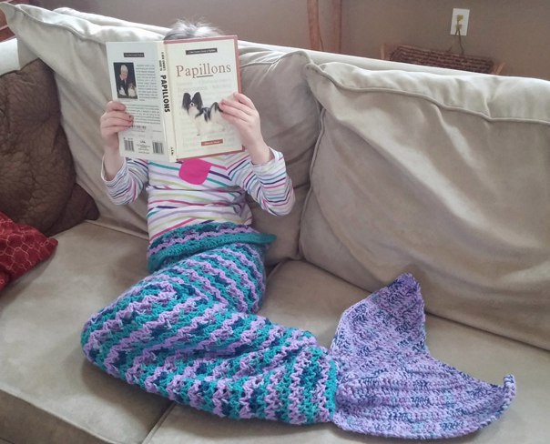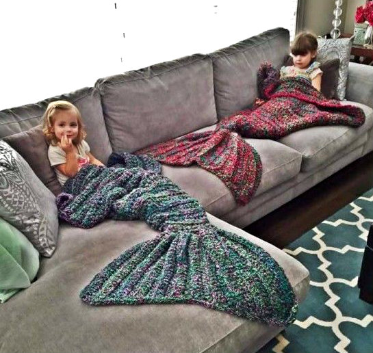 Только вязаный плед - вещь хоть и красивая, и полезная, но вязать его долго, стирать трудно, да и пряжи больше уходит. А такой мешок в виде хвоста русалки и согреет, и украсит интерьер, и связать можно быстрее, чем плед (хоть и сложнее немного). Да и как-то веселее не просто укрыться, а залезть в «хвост русалки».