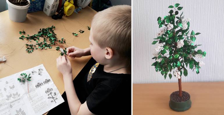 Сейчас вот потихоньку собираем дерево из пайеток - бонсай.