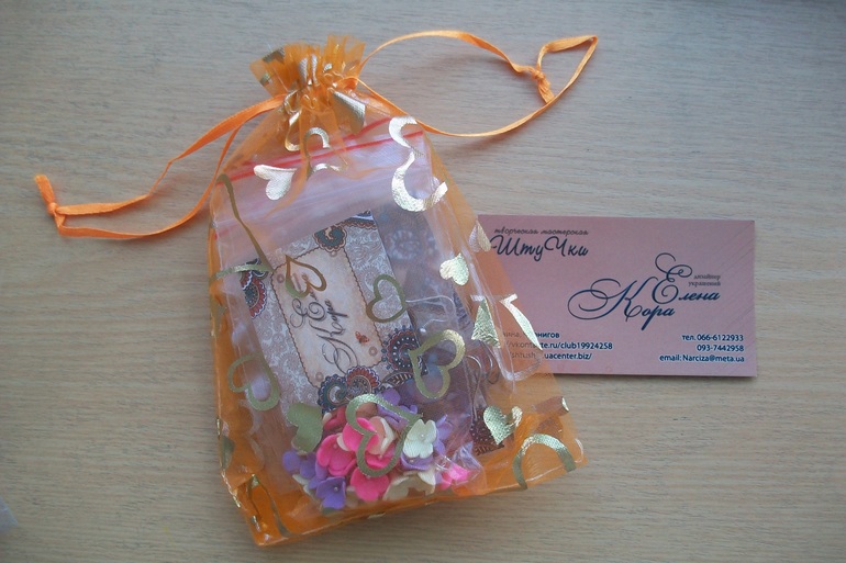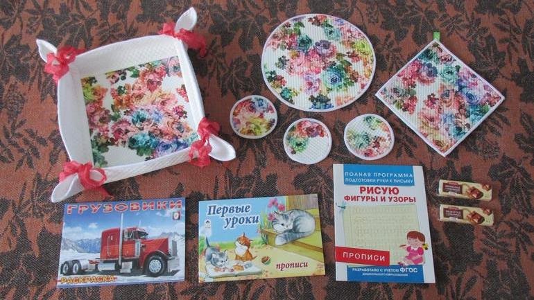 Договорились мы с Еленой об обмене. Она от себя предложила чудесный цветочный набор для кухни. Ну, и в посылке мы нашли еще небольшие подарочки