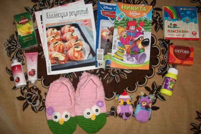 Договорились мы с Катерина устроить небольшой обменчик: я хотела вязаные тапочки и маленького совёнка, а в итоге получила кучу добра для себя и сына: