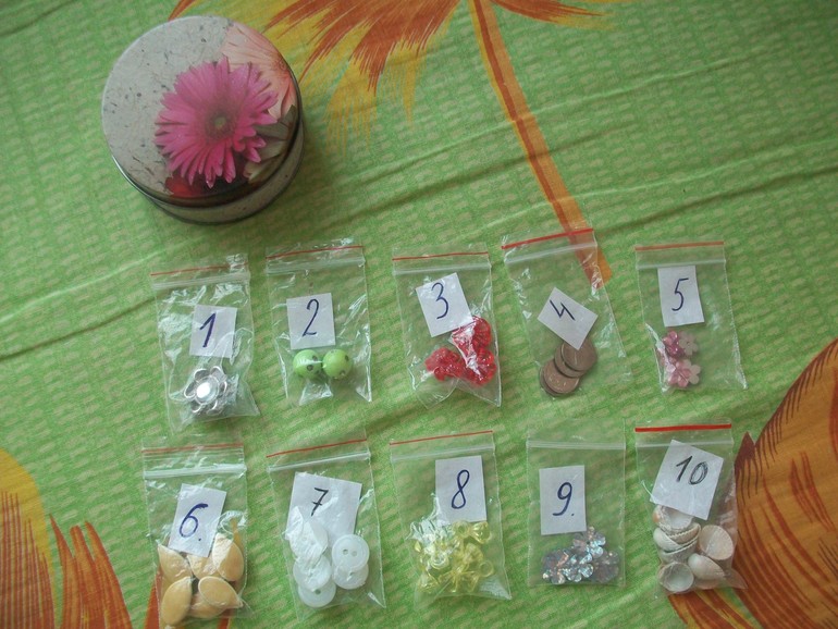 Уже давно я припасла разную мелочевку, собираясь впоследствии сделать для сына карточки для счета. Разложила по пакетикам и подписала цифры. В итоге т.к. сын любит везде залезать и во всём ковыряться, то мы начали играть и с этими пакетиками: высыпали содержимое, смотрели на цифру, пересчитывали и складывали все обратно.