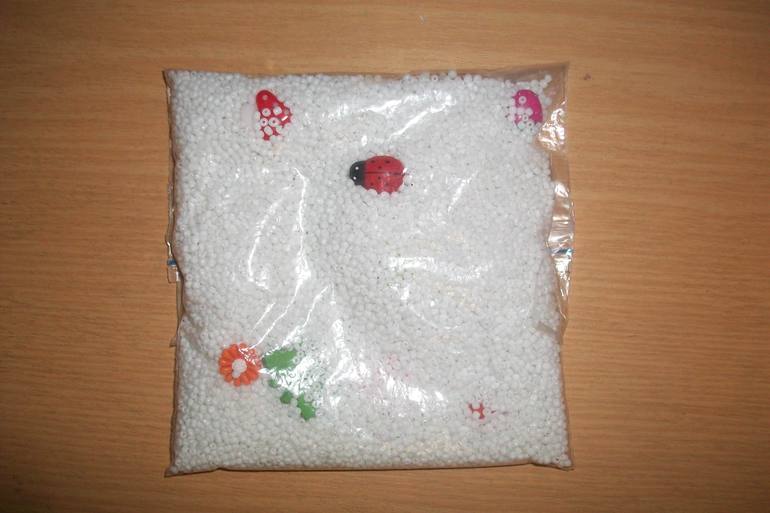 Сделала простую искалку для маленьких ручек. Прозрачный пакетик, белый бисер и разные пуговки: божья коровка, яблочко, цветочек, грибок мухомор, следок, бабочка, ягодка. Пакетик заклеила скотчем. Всё просто и быстро.