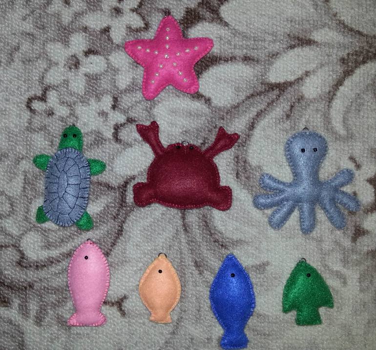 Сделала очередную игру-развивалку для сына: 4 рыбки, звездочка, черепашка, рак и осьминожка. Фотоаппарат временно отсутствует, поэтому качество фото далеко не супер(