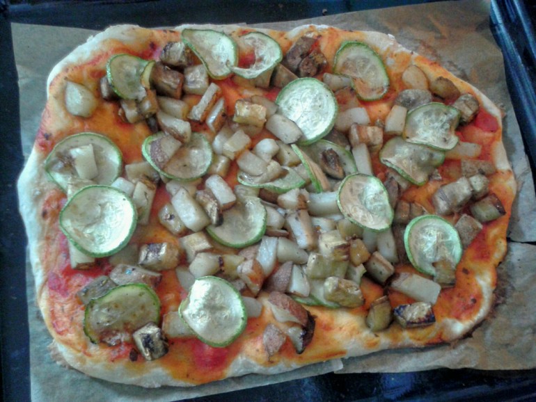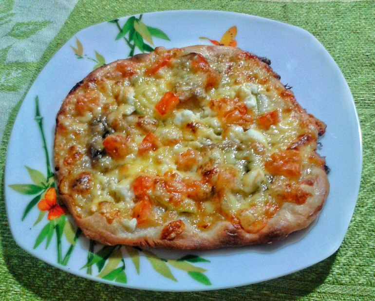 Вчера была пицца на тонком тесте с лисичками, но ее я даже сфоткать не успела. Сегодня, раскатав тесто потолще, вышло вот что