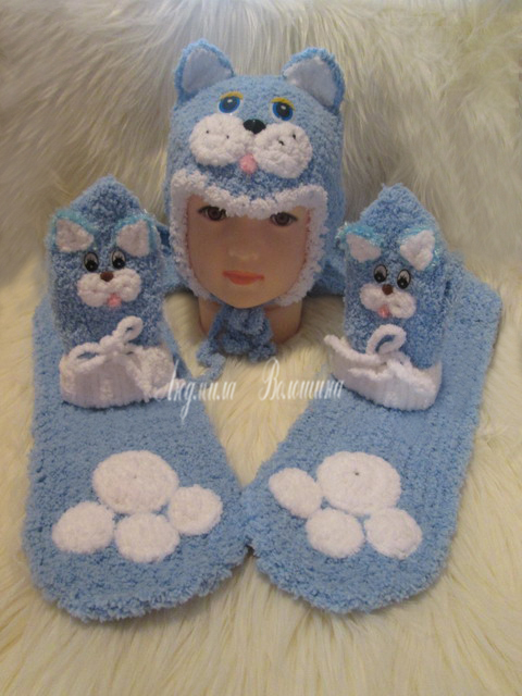 Предлагаю комплект Лёвушка, он состоит из шапочки, шарфика, пинеток и варежек. Связан комплект из тёплой, пушистой, нежной пряжи. Шапочка хорошо защищает лобик малыша от ветра, мороза. Ушки защищают от холода наушники. Пинетки имеют фиксирующие шнурочки.Шарфик 115см*15см.Варежки так же с фиксирующими шнурочками. Забавный комплект с мордочкой Львёнка , пинетки и варежки Львята смогут быть и развивающими игрушками для малыша :), он будет показывать глазки, носик, ушки..:) Комплект изготавливается по заказу, по мерочкам заказчика.