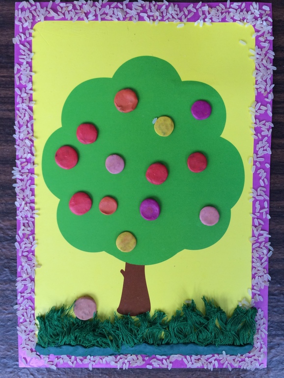 Несложная яблонька. Яблочки почти все Владькины, рисом украшал тоже он. Траву из ниток мулине делала больше я. :)