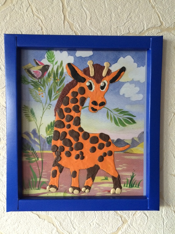По случайному совпадению жирафью тему мы продолжили. Вот такой набор для пластилиновой аппликации Влад получил в подарок от бабушки. Ох, и сложная была работа! Тело оранжевым и коричневые пятна Владик ещё кое-как мог лепить. Но вот голова и ножки... Трудно. Я много сделала сама. Но участвовать Владику в любом случае было интересно. Теперь этот жирафик стоит у бабушки Ниллы. Очень он ей нравится. :)