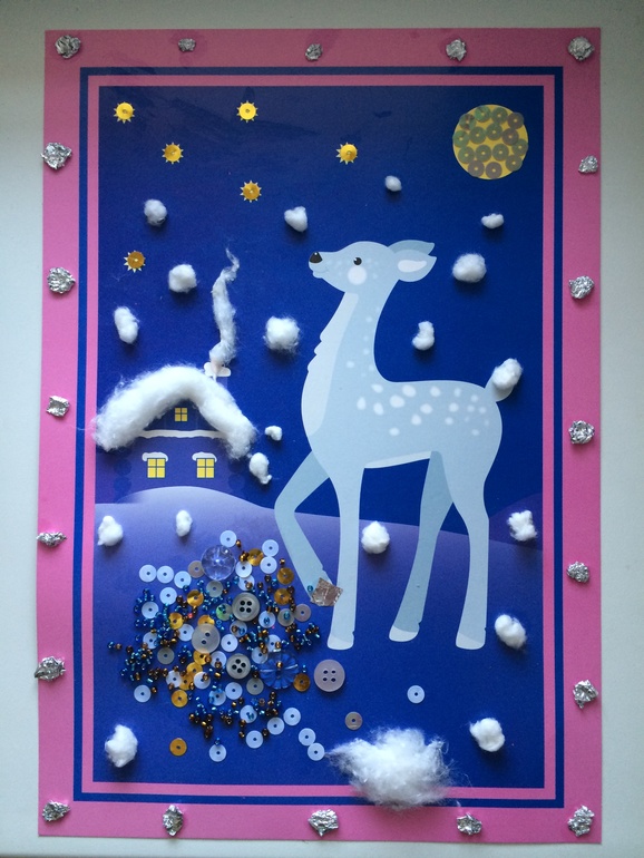 Вата, пуговицы, бисер, пайетки, фольга. Владику очень ноавятся эти наборы. Уже многое сделали из них. Мажет клеем, приклеивает с удовольствием.