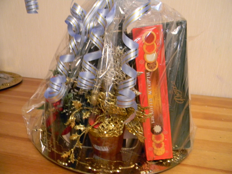 Идея была придумана заранее:) упаковка-пленка 39 руб , лента около 40 руб., Декоративные веточки-65 руб. и 50 руб.(точно не помню, но не больше).