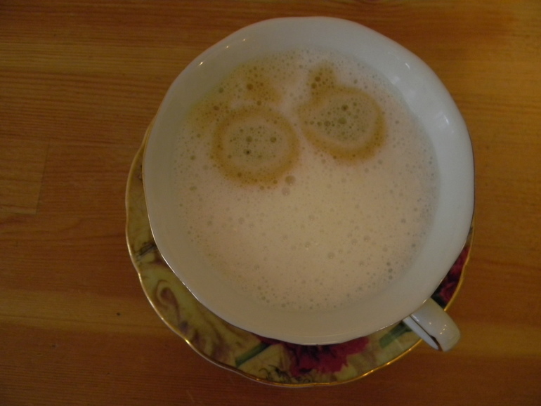 Есть у нас с мужем такая привычка или уже традиция:)) пить капуччино из кофемашины часов в 16-17 дня... Поскольку я с энтой техникой не дружу, то сие удовольствие доступно мне только в дни пребывания мужа дома, а в остальное время довольствуюсь черным... так к чему это я ?... ааа... так вот, сварил муж кофе, а там вот такой узор:) ну, конечно, случайный... это что-то значит?:)