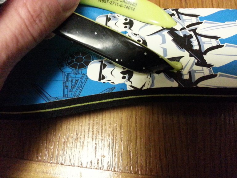 Картинки со звёздными войнами это как бы самый верхний слой сланца на подобии клеёнки. Этот слой приклеен к остальной толстой части сланца. Вот у этой клеёнки есть небольшие повреждения от транспортировки,т.к.в посылку всё так напихали, что сланцы очень плотненько в ней лежали.