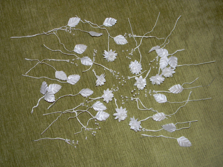В подарок к платью отдам аксессуары: нижнюю юбку, фату и набор цветов на голову. Фата диаметром 102 см. Каждый цветочек и листочек из набора можно зафиксировать в прическу как Вам нравится.