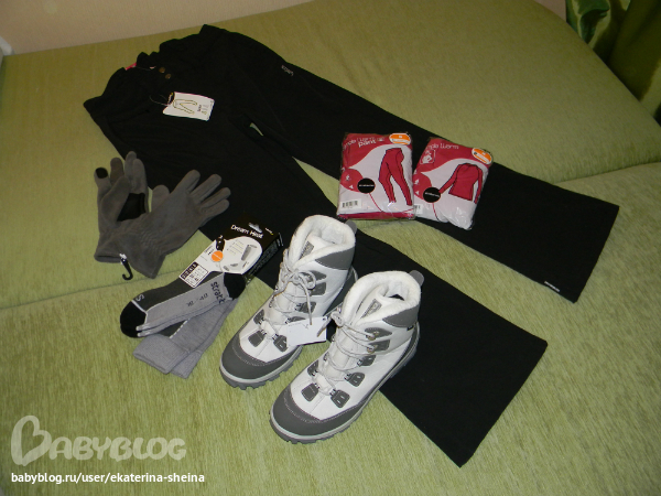Итак, мне приобрели: термобельё, тёплые горнолыжные штаны, тёплые и удобные ботинки, термоноски и зимние перчатки. Помимо этого, ещё купили шапку мужу и по комплекту термобелья мужу и моему папе. За всё)))))))))))) отдали 7 тыс. Я очень довольна.