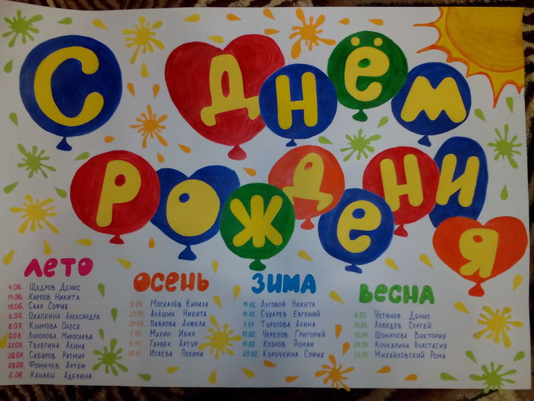 Наши событияВот наконец-то готов стенд с днями рождениями, выполнен акварелью, фломасьерами, а также использована цветная бумага))) думаю всем понравится)))