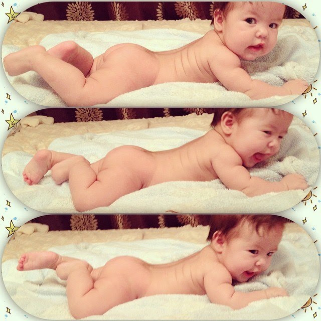 Держит голову! Переворачивается во все стороны! Смеется в голос! Лялякает что-то на своем языке! Реагирует на мой голос улыбкой! Плачет, едва заслышав работающий пылесос! Часами может гулить под мобиль! Не спит на прогулках!