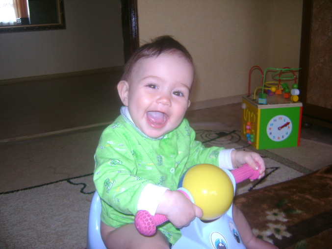 сама, без ручек. Может обойти всю квартиру, придерживаясь за стеночку. Начала повторять за мной звуки, которые я ей произношу, ну, что-то типа ААА, УУУ, ООО и т.д. Мама и папа, вообще четко выговаривает. Во вторник у нас были две мои подруги с детьми, у всех ребятишек разница в возрасте - неделя. О-о-очень интересно было смотреть, как Варя общается с ровесниками, да ещё на своей территории. Лидер однозначно! Во-первых, тут же давай показывать, как умеет ходить, во-вторых, как умеет громко-прегромко кричать (но не плакать), в третьих, она у нас забияка оказывается! Несколько раз оттаскивали Варю от мальчика, которого она пыталась по головешке постучать. Нарезала круги вокруг своих гостей на четвереньках, бедные гости не ожидали такого напора и конечно, подрастерялись. В следующий раз мы идем в гости к ним, посмотрим, как Варя будет в гостях выделываться и будет ли. Надо фото добавить, а фотоаппарат в комнате, где доча спит. Так что, чуть позже...