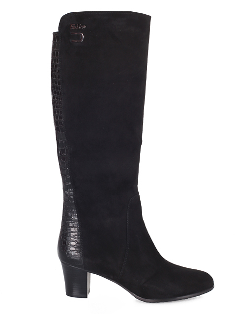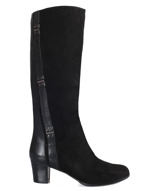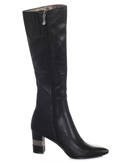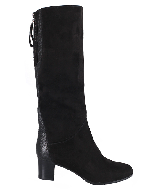 Модель на устойчивом каблуке. Голенище декорировано эффектными вставками. Для удобства с внутренней стороны голенища предусмотрена застежка на молнию.Высота каблука 5,5 см.