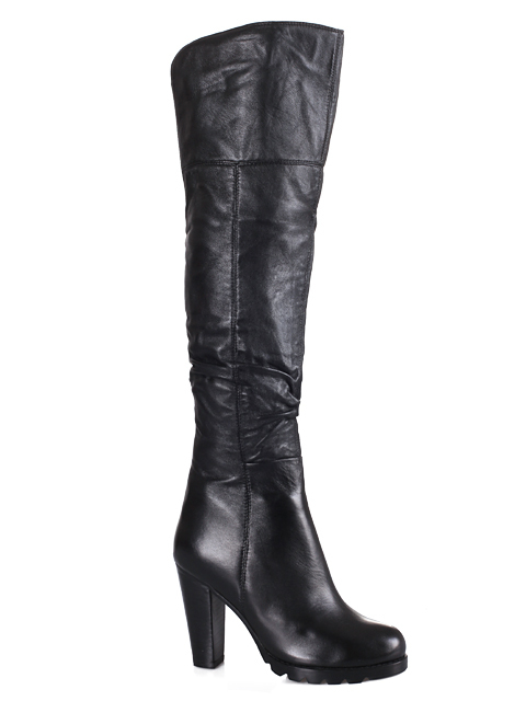 Модель на устойчивом каблуке .Голенище декорировано складками.Высота каблука около 7 см.
