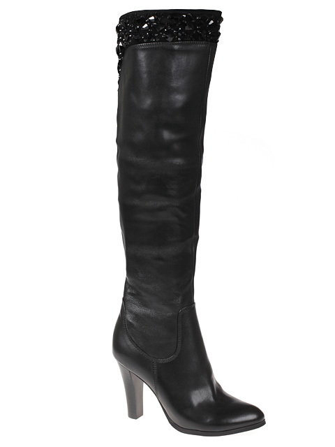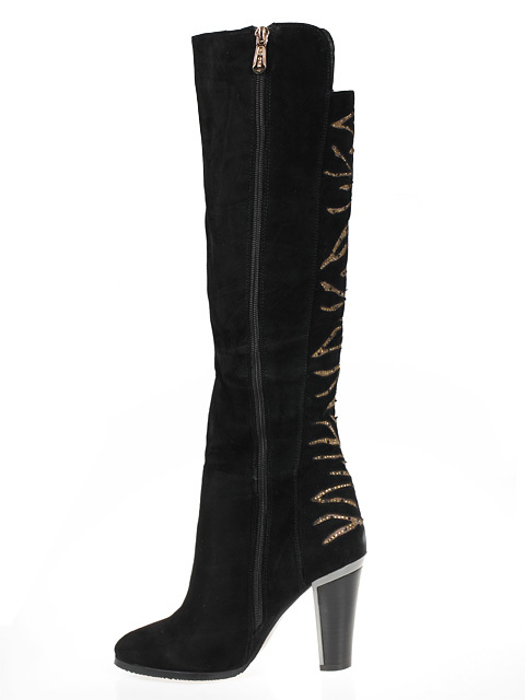 Потрясающие высокие сапоги украшенные декором из страз. Модель дополнена устойчивым каблуком оригинального дизайна.Высота каблука около 10 см.