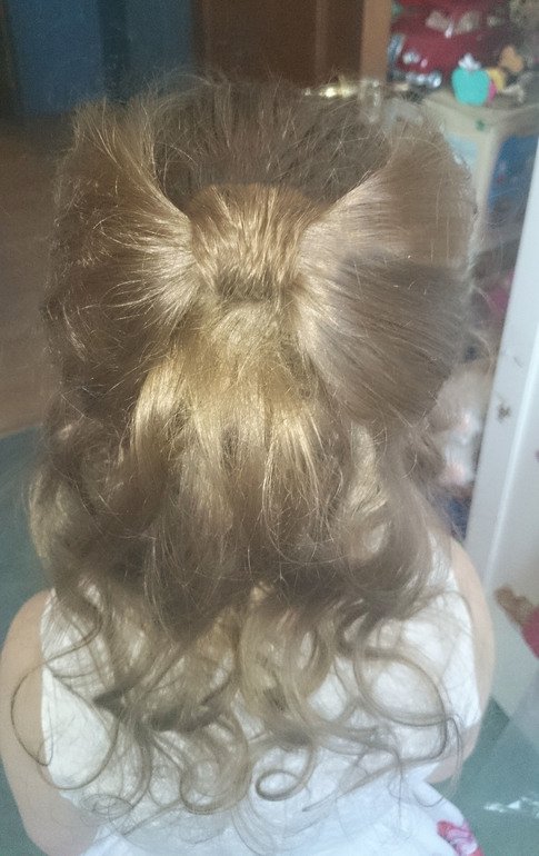 Сделала.) У нас волосы сантиметров на 10 ниже подмышек)), поэтому длины нам хватило вполне. Бантик конечно покороче, чем на картинке, но тоже не плохой получился.) А вот с объемом у нас конечно проблемки.) За счет начеса только создала объем.