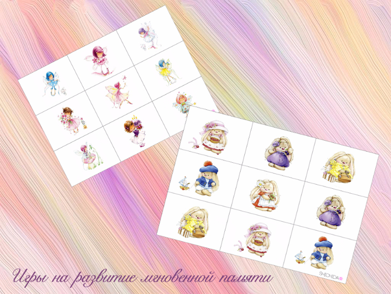 Покажите ребенку 1 картинку ( на 2-3 секунды) , потом разложите несколько однотипных и ребенок среди них должен найти ту, которую видел в начале. Игру можно усложнять количеством карточек. за репост адрес в личку